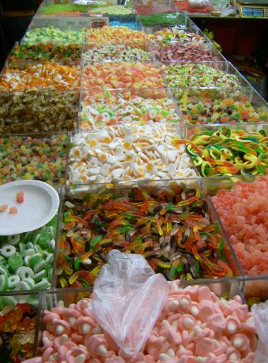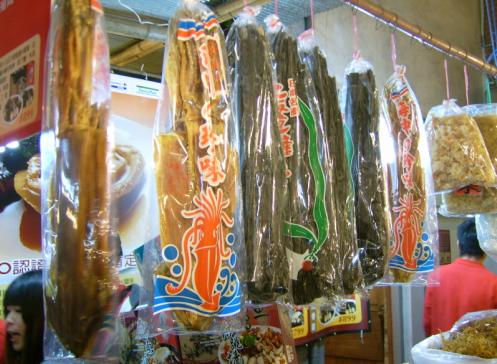 再來就是小朋友最愛的零食啦!太空食品、軟糖、糖果、巧克力堆得一山比一山高,而且店家也很大方的讓民眾試吃,還分口味幫大家切好擺盤,真是太熱情了!