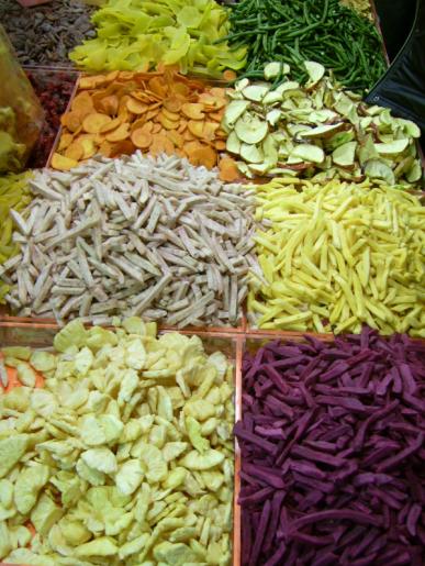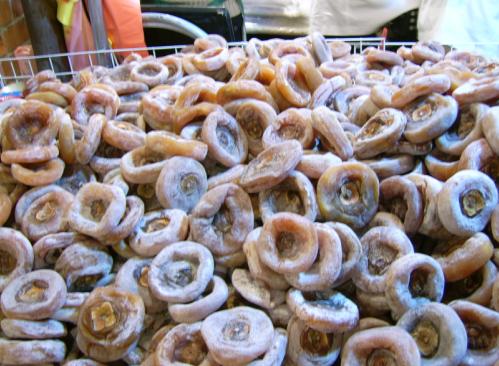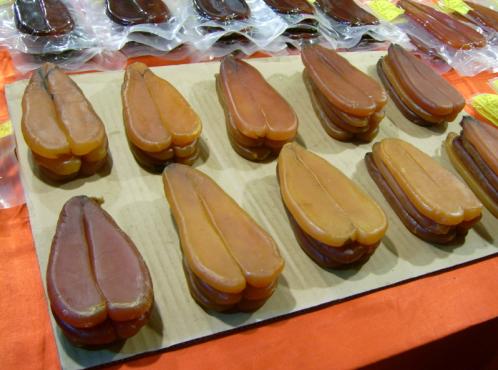 既然是南北貨的大本營,就少不了烏魚子、鮑魚、人蔘等名貴食材,烏魚子又分為野生與養殖的烏魚,其製作過程中,鹽分的入味是一門學問,再來是透過曝曬來決定它的軟硬度。採購的時候最好選有真空包裝的烏魚子,因為它隔絕了與空氣接觸,減少變質的可能性。吃的時候依個人習慣切片微微烤過即可。
