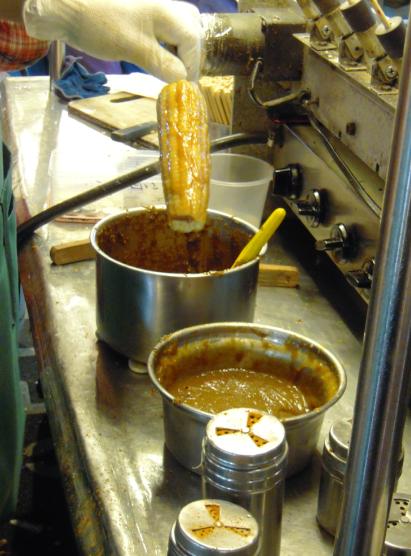 烤玉米的第一道手續,也是省時的方式之一,就是水煮玉米。先煮到半軟的程度,再上火爐微微烤乾,接著,將較硬的部份刷掉,讓吃起來的口感更好。