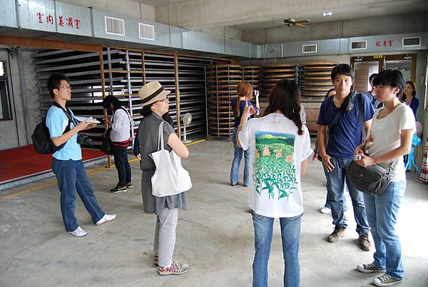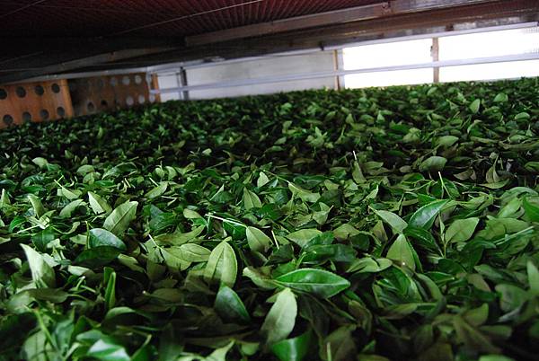 一進到製茶廠就被它的日曬場給吸引住,在地板上攤開來一大片的茶葉葉片,每一株都是精挑細選過的一心二葉。