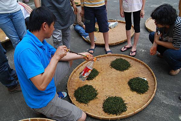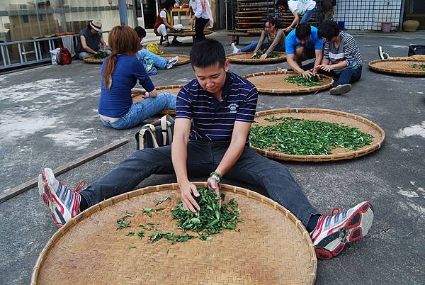 女主人說:「整個製程大約要花兩個小時」,一聽到兩個小時都要這麼精實的把茶葉擠壓成形,大家都抱著一股「跟你拼了」的氣勢,兩腿跨開,跟著達人一起揉茶。