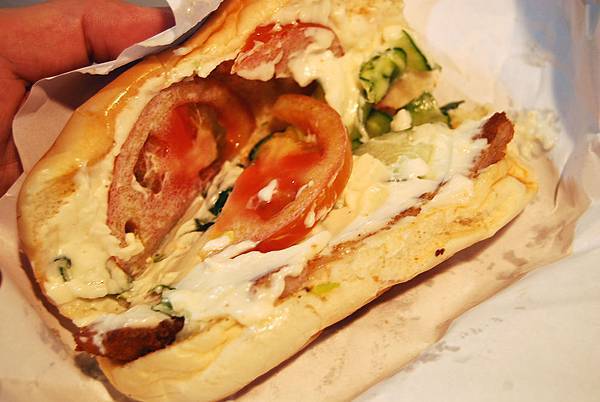 等待號碼牌叫號後即可取餐,我點的是碳烤豬排麵包,一拿到時很像是沙威瑪的樣子,但它的肉片是連在一起的,扁平紮實,如果厚度能再增加其實口感會更棒,當然,一分錢一分貨嘛,45元的價位其實很OK!