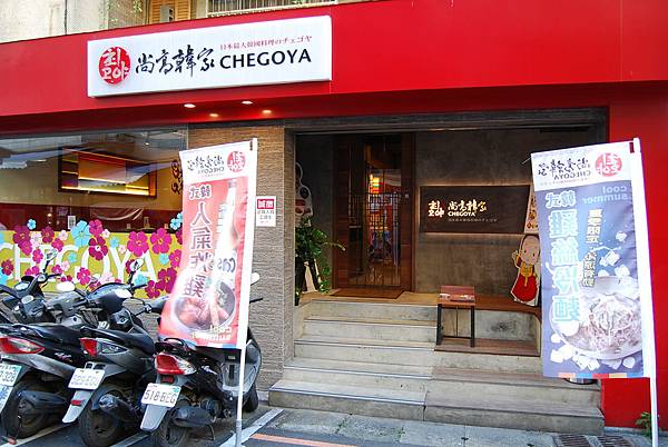 「Chegoya尚高韓家」近延吉街的小巷子裡,外觀以紅色為主體,簡約的門口外觀,韓式線條邊框設計,一進門就令人感到驚艷。