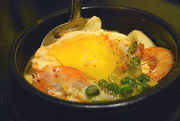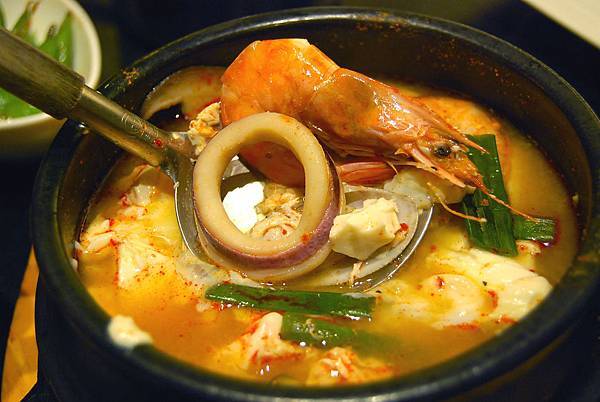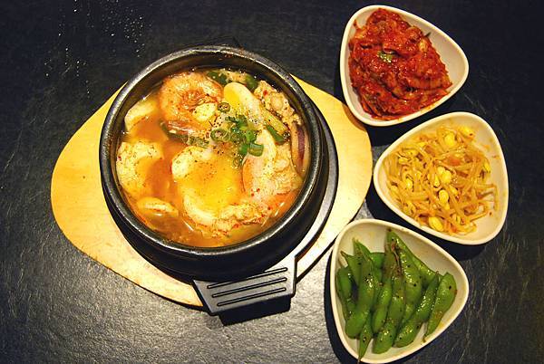 湯頭以牛骨精燉而成,加入韓式辣粉形成完美比例,加入鮮嫩的豆腐、海鮮料,最後打上一顆蛋,就成了這道招牌辣湯豆腐鍋了!