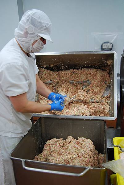 豬腿肉與肥肉分開處理,再依不同比例放入,成本較高,但吃起來口感較好,也是工廠選料的堅持。