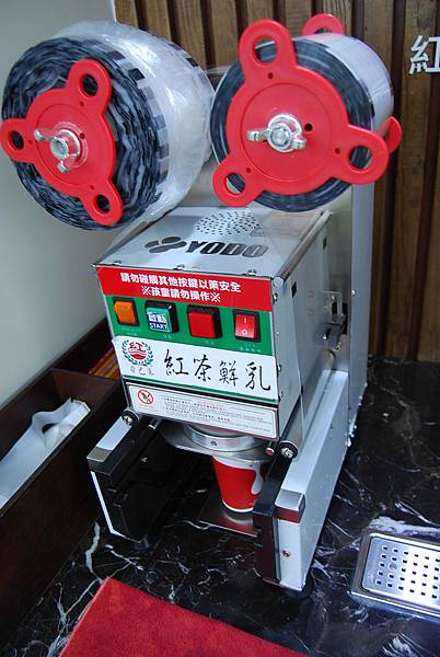 這家「自己來紅茶鮮乳」,在店門口就放著一台包裝機跟兩個水龍頭,原來轉開水龍頭,就可以自己倒紅茶耶!