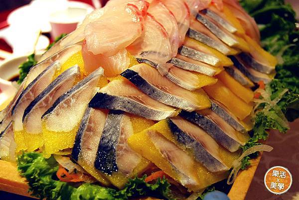 首先登場的是生魚片及烏魚黃金雙拼盤,魚肉的色澤閃閃發亮,看起來很新鮮,整條船造型的份量也很足夠,以這個來當開胃菜其實也不錯。