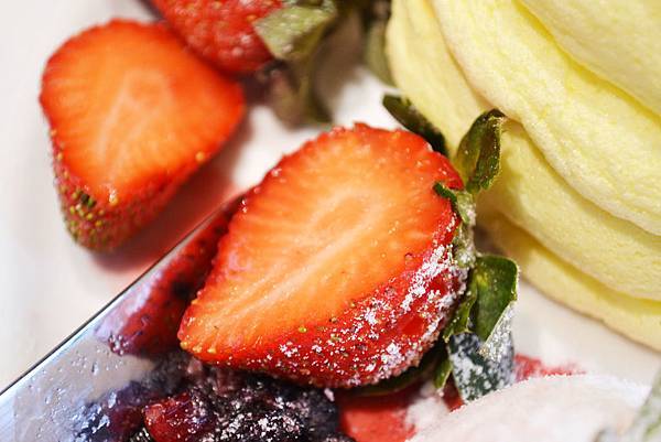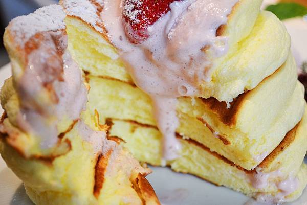 雖然名稱為三層,但仔細一看就像有六層一樣厚實,每日現點現做的新鮮度,加上熱呼呼的口感,就是好吃的關鍵,一旁還有新鮮草莓與草莓鮮奶油,沾上甜甜的蜂蜜,滋味絕佳!