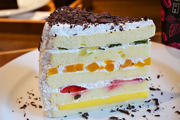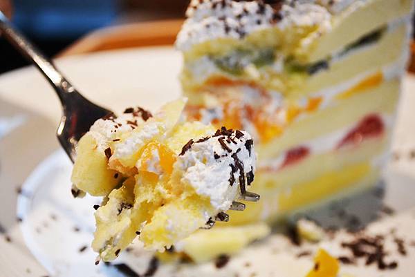 五彩繽紛的水果蛋糕,綠、黃、紅層層相疊看起來就很好吃,綿密鬆軟的蛋糕之中,還能吃得到水果多汁的口感,最後加上香甜QQ的布丁,口感好得不得了!