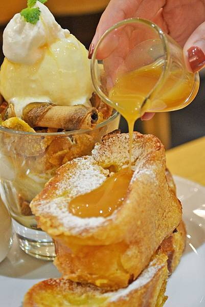 外觀非常漂亮的太妃焦糖法式歐蕾吐司,在法式歐蕾吐司上撒滿糖粉,再淋上香甜的太妃焦糖,充滿無限幸福滋味~
