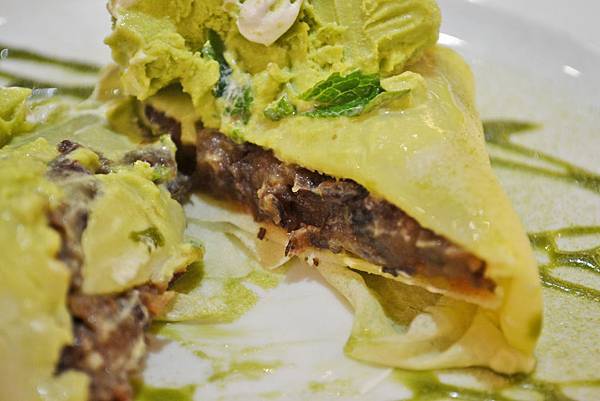 綠意盎然的法式抹茶捲餅,餅皮包著紅豆餡,再放上抹茶冰淇淋,吃起來有濃濃茶香,還有冰冰涼涼的口感,有點像是到京都吃當地特產一樣。