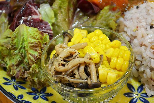 配菜的玉米與菇類少油又健康,與清爽生菜一起吃最對味,配色好看、食材優,其它咖啡店可是吃不到的喲!