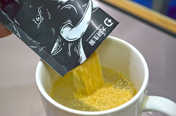 磨成粉狀的瑪卡可依個人喜好配白開水,或是將粉加到水中拌一拌再喝,特別的是,原以為會帶點苦味,結果卻像是維他命C那種酸酸甜甜的味道,有種在喝運動飲料的感覺,超好喝的耶!